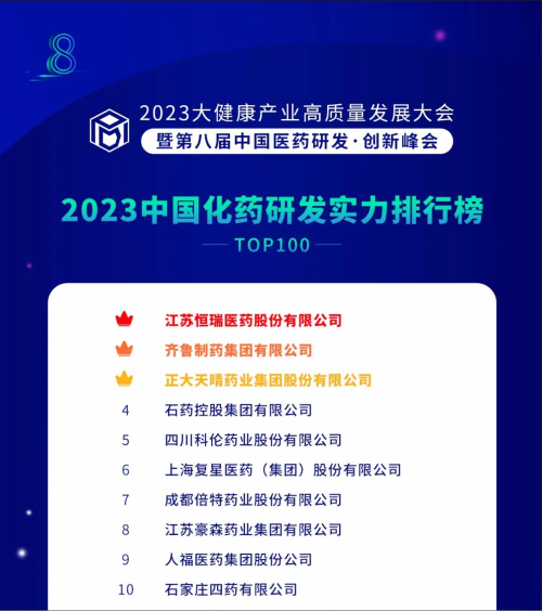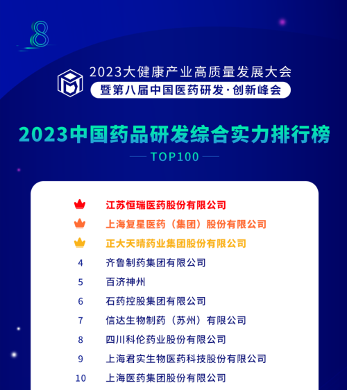 由药智网、中国药业杂志社主办的2023大健康产业高质量发展大会暨第八届中国医药研发•创新峰会于6月16日开幕,会上发布了《2023中国药品研发实力排行榜》系列榜单,AG真人医药凭借深厚的创新研发实力再创辉煌:荣登《2023中国药品研发综合实力排行榜TOP100》榜首、《2023中国化药研发实力排行榜TOP100》榜首。值得一提的是,今年是AG真人医药连续第6年入选《中国药品研发综合实力排行榜》榜首。